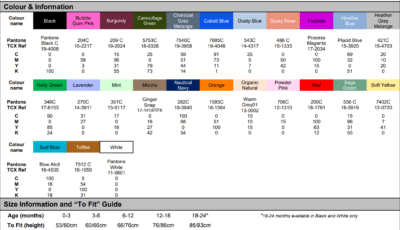 BLACK, BUBBLE GUM PINK, BURGUNDY, CAMOUFLAGE GREEN, CHARCOAL GREY MELANCE, COBALT BLUE, DUSTY BLUE, DUSTY ROSE, FUCHSIA, HEATHER BLUE, HEATHER GREY MELANGE, KELLY GREEN, LAVENDER, MINT, MOCHA, NAUTICAL NAVY, ORANGE, ORGANIC NATURAL, POWDER PINK, RED, SAGE GREEN, SOFT YELLOW, SURF BLUE, TOFFEE, WHITE
