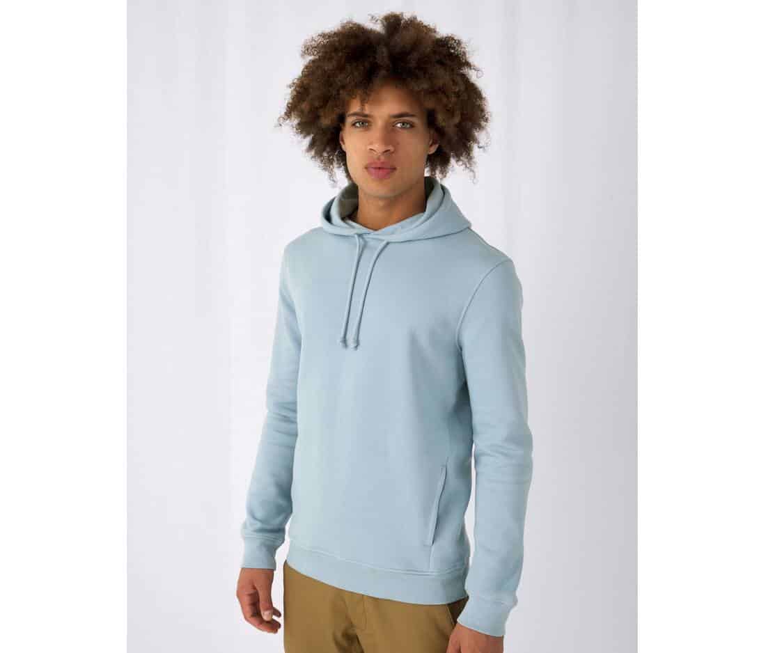Organic Inspire Hooded Herren Sweatshirt in Hellblau, getragen von Model vor weißem Hintergrund