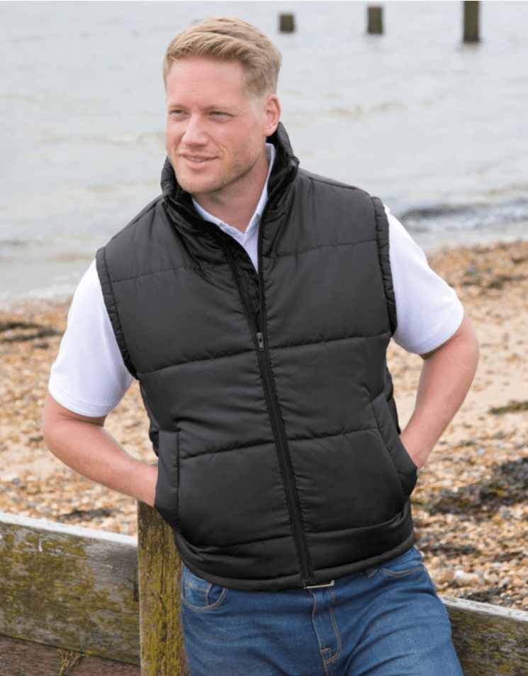 Core Bodywarmer für Herren am Strand, ideal für Branding mit individuellem Druck.