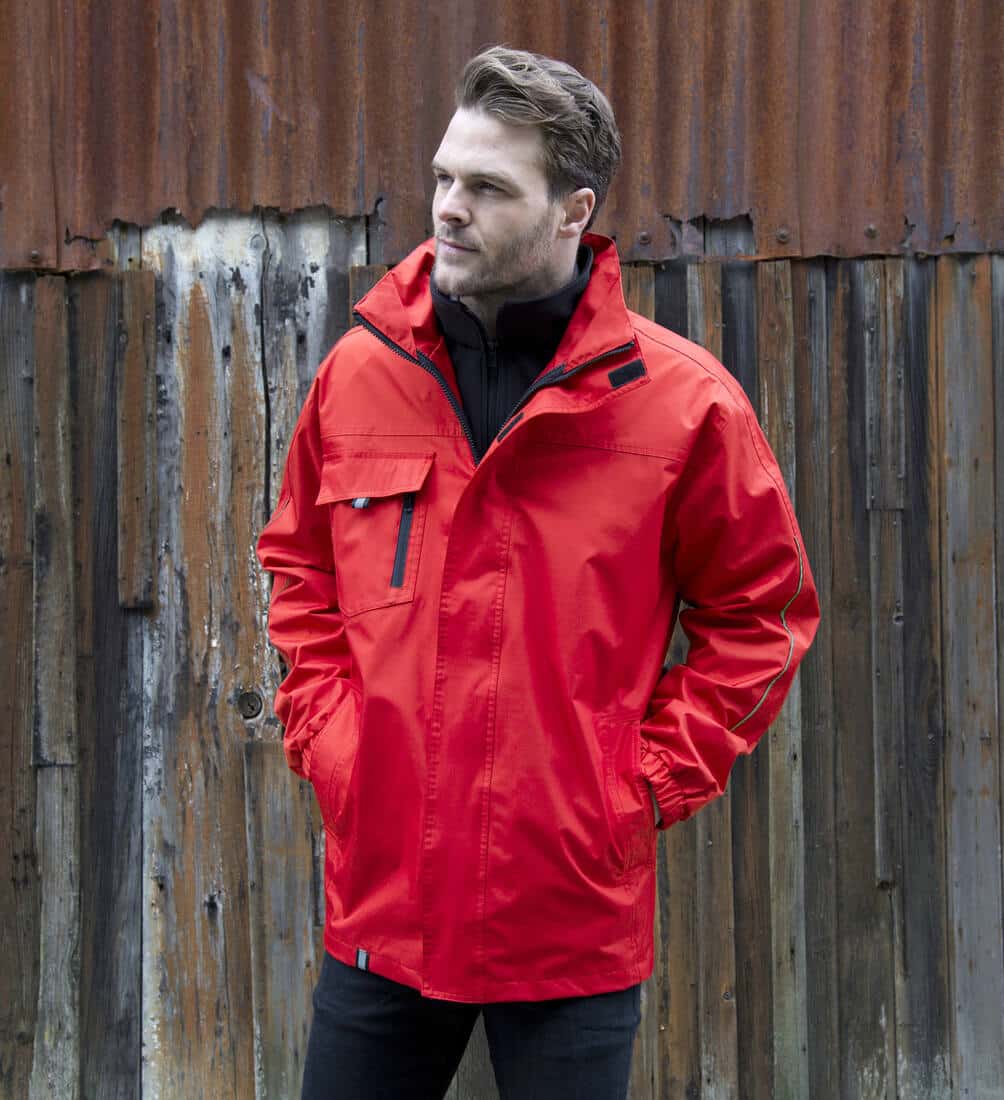 Mann trägt eine leuchtend rote 3-in-1 Transitjacke vor einer hölzernen Wand.