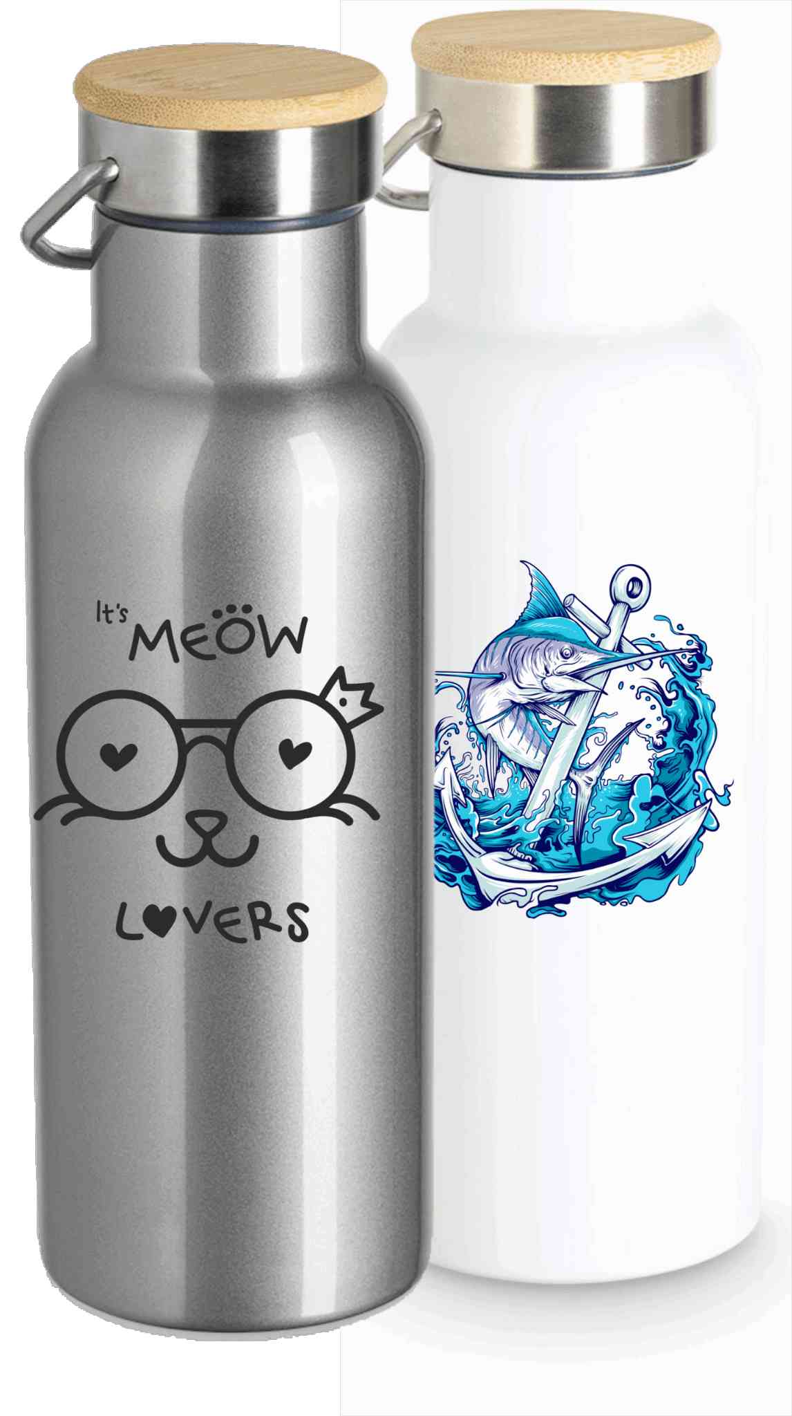 Zwei Edelstahl-Trinkflaschen mit Bambusdeckel, eine mit Katzenmotiv und „It’s Meow Lovers“-Aufdruck, die andere mit maritimem Design eines Schwertfischs und Ankers.