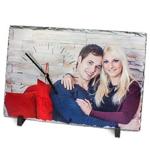 Personalisierte Wanduhr aus Schiefer mit Fotodruck eines Paares, montiert auf schwarzem Standfuß mit sichtbaren Uhrzeigern.