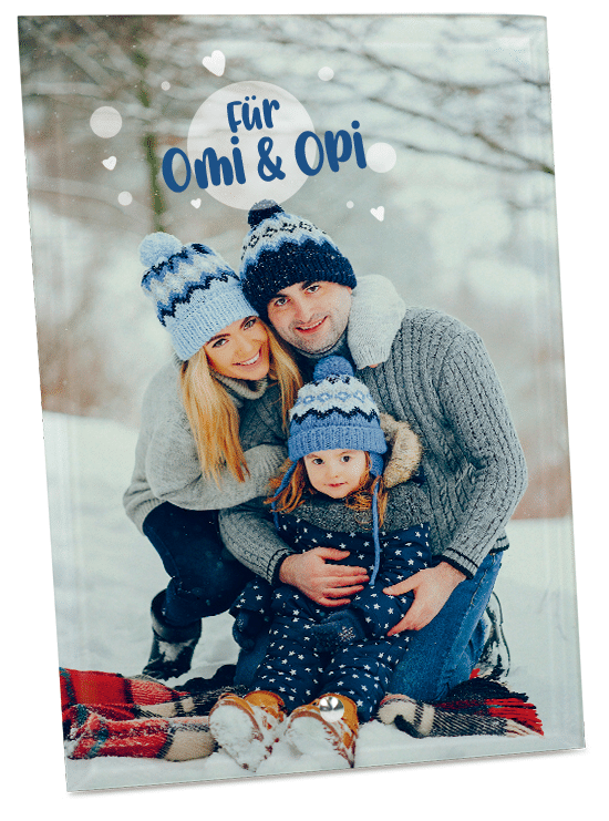 Personalisierte Schiefertafel (24×39 cm) mit Fotodruck einer Familie im Schnee und dem Schriftzug „Für Omi & Opi“.