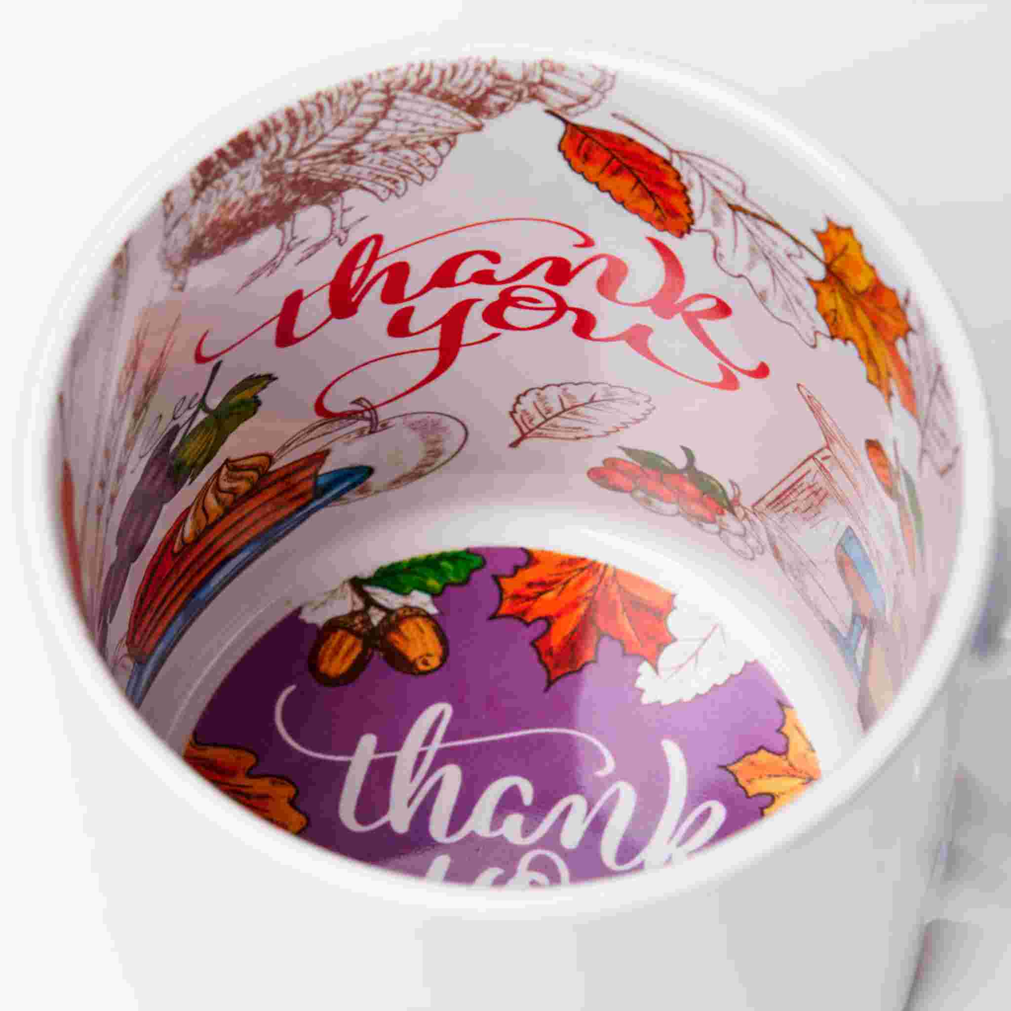 Herbstlich gestaltete Innenseite einer Tasse mit dem Schriftzug „Thank You“, umgeben von bunten Blättern, Eicheln, Gemüse und einem Truthahn.