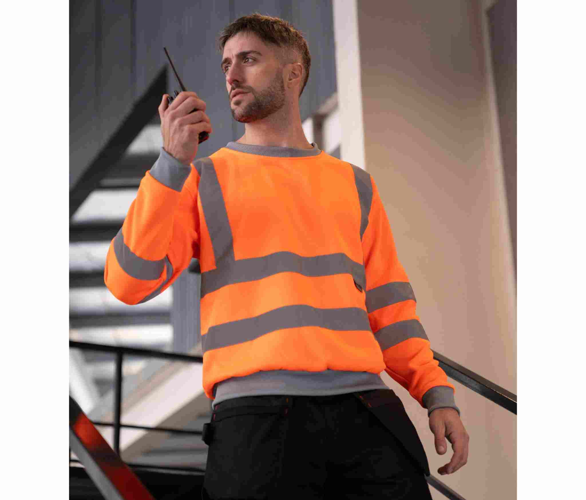Mann mit leuchtend orangefarbenem Hi-Vis Sweatshirt „Limerick“ mit reflektierenden Streifen, ideal für Arbeitskleidung