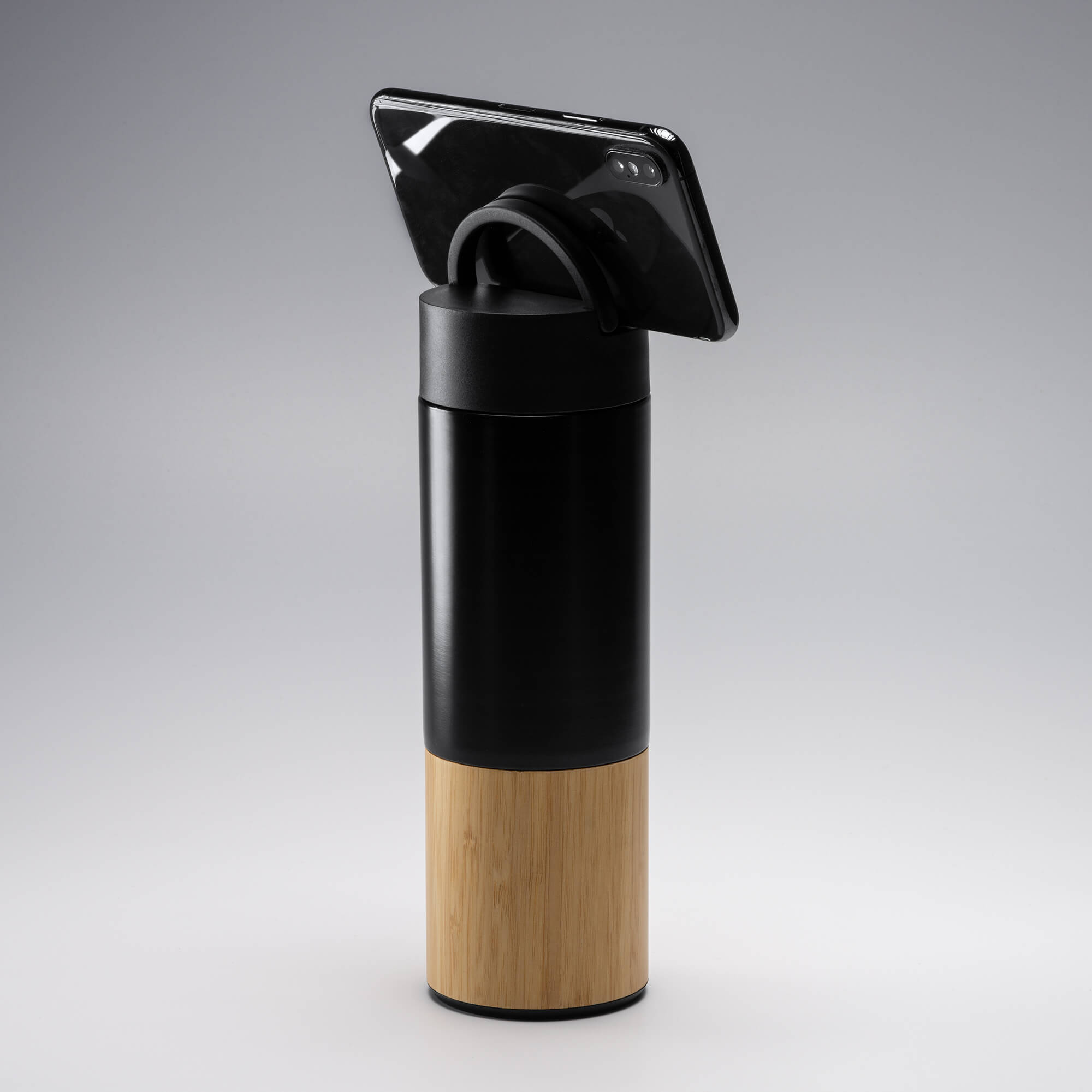 Doppelwandige Thermosflasche aus Edelstahl mit Bambusdetail inkl. persönlicher